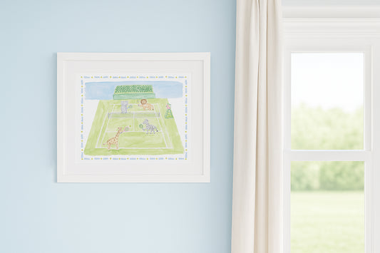 "Wild at Wimbledon" Blue Watercolor Animals Tennis Print