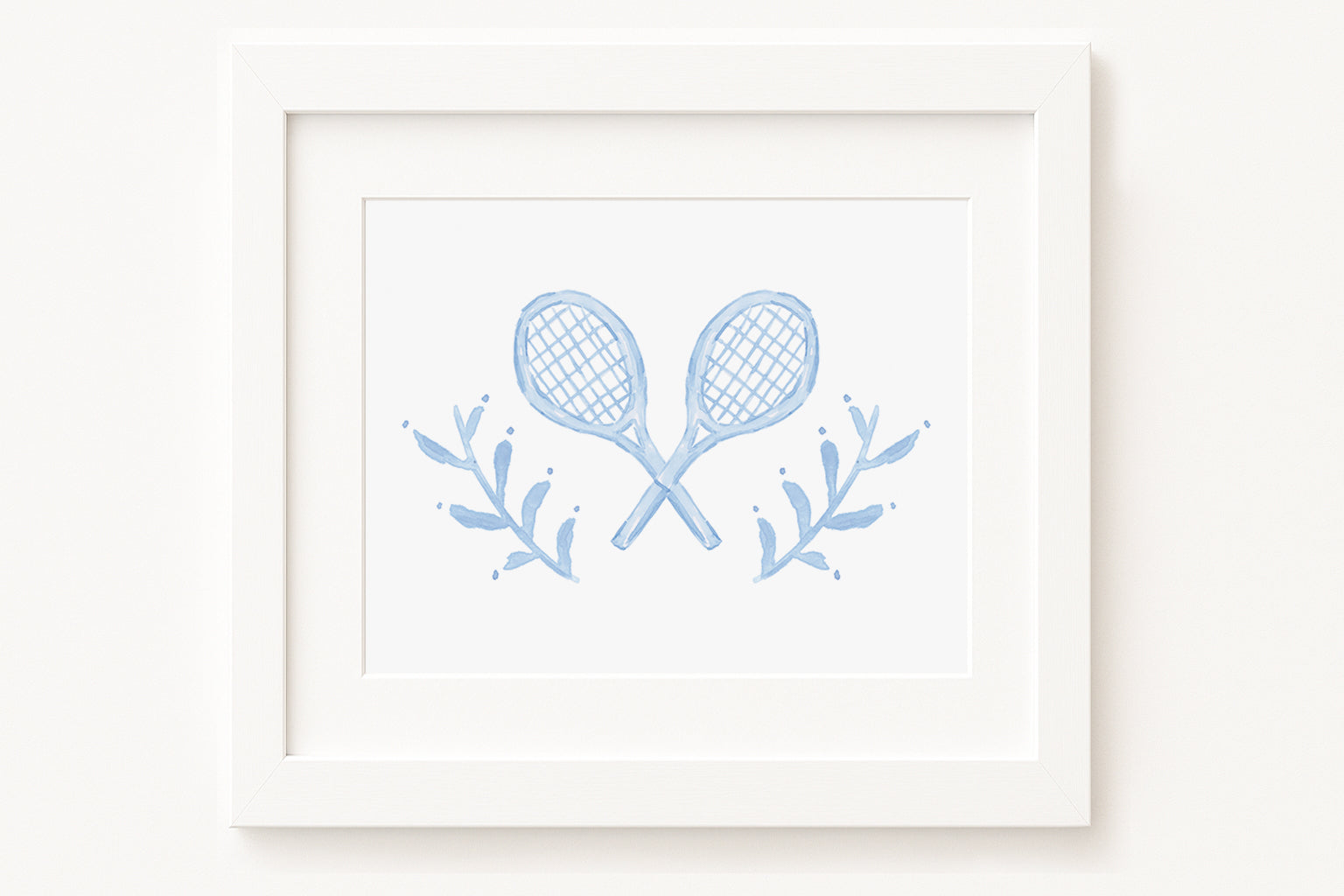This hand-drawn watercolor art print features two crossed blue tennis rackets with blue leaves on either side in a horizontal orientation.