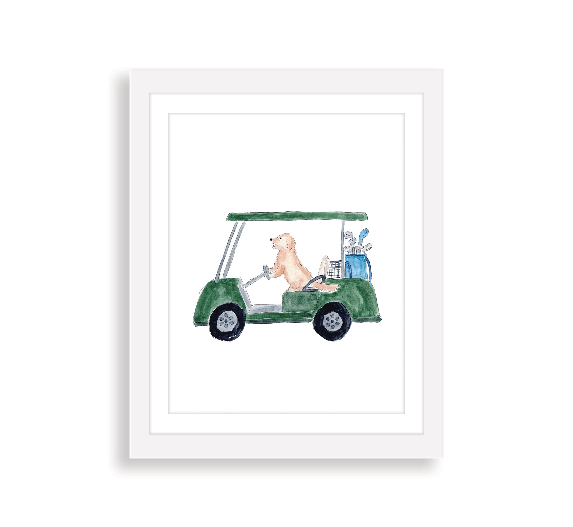 Bring a touch of playful sophistication to a child's space with this print of a golden retriever in a green golf cart.