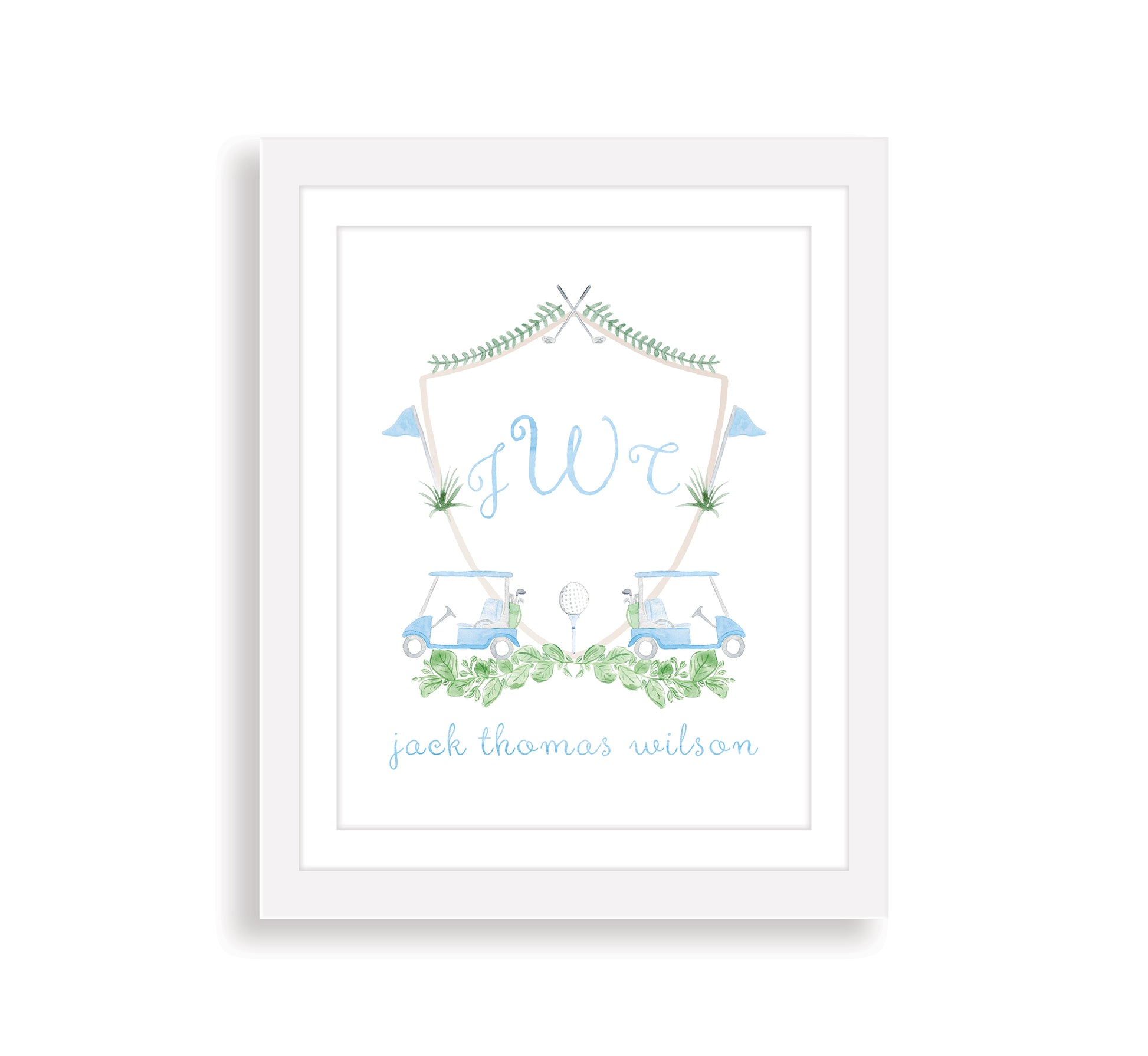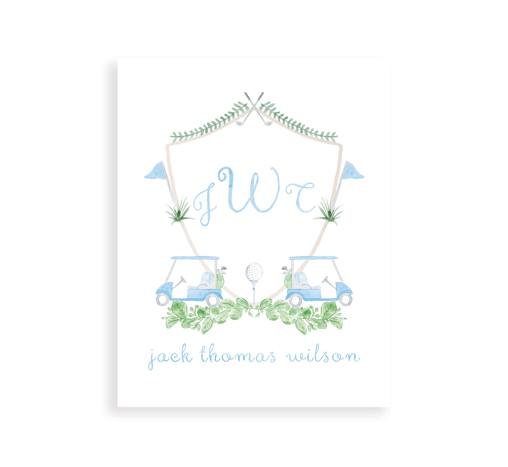 Add a touch of personalization to your baby's nursery with this monogrammed golf crest in blues and greens with the option to add your child's name below the crest. This semi-custom, made-to-order print features a tan crest, blue monogram, golf clubs, golf flags, a golf ball and tee, and golf carts. The print would be perfect for your baby boy's nursery or as a hospital welcome sign.