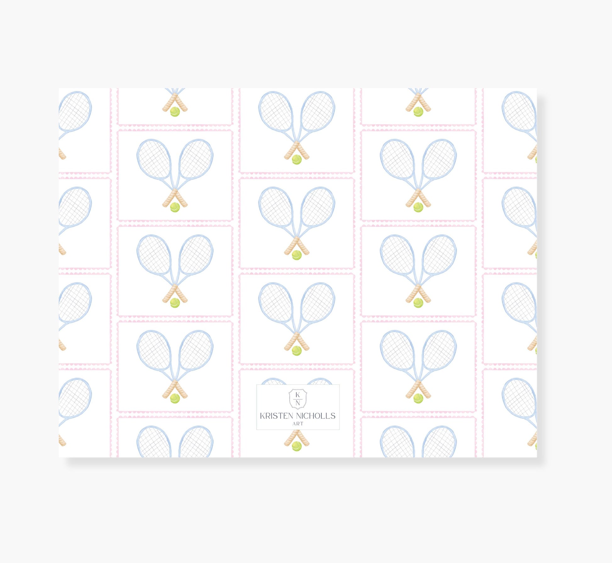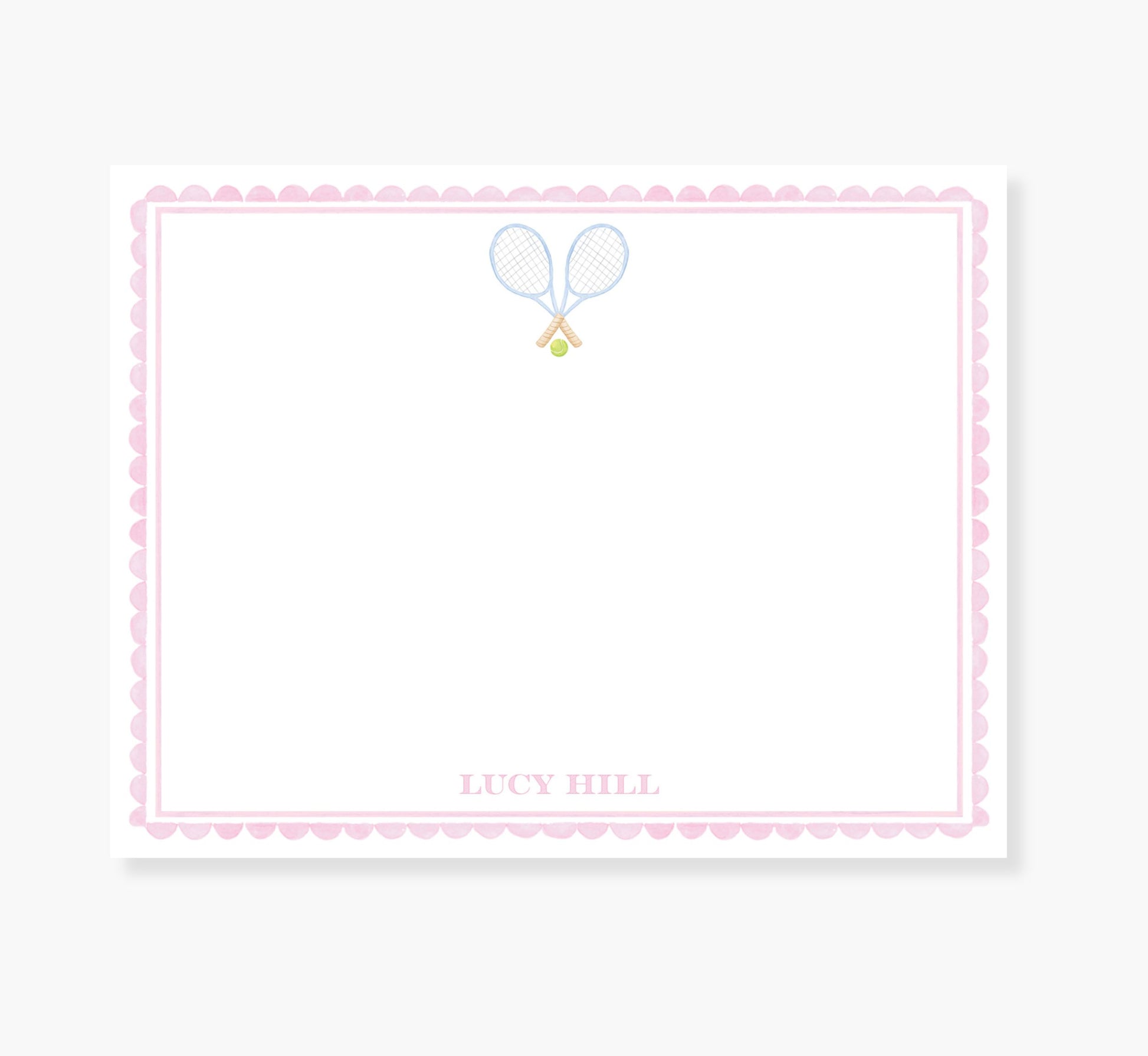 This personalized tennis-themed flat stationery features hand-painted watercolor artwork of tennis rackets and a pink scalloped border. A charming tennis racket and pink scalloped pattern is on the back of the stationery along with the Kristen Nicholls Art logo. White envelopes are included with your purchase in the quantity you order.